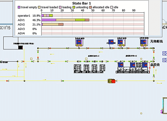 根据方案规划的运行路线,然后搭建对应的虚拟3D模型以及输入实际的运行节拍,最后模拟测试出AGV的运行效率