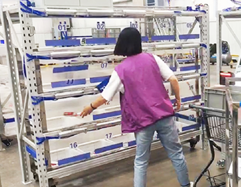 基于灯光指令的先拣后播方案:系统自动将多个订单的商品汇总,再逐一按订单进行分货。