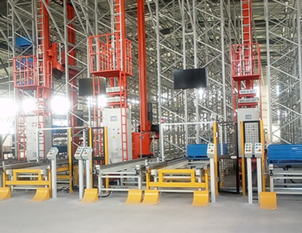 高位堆垛机用于完成货物在货架范围内的纵向和横向移动,实现货物的三维立体存取。
